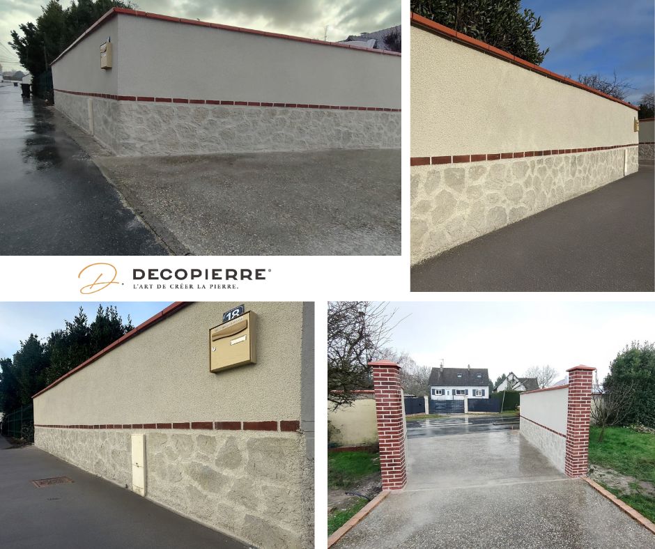 Cette finition en briquettes apporte du relief au mur, tandis que les poteaux de portail en briquettes renforcent le caractère de l’entrée.
